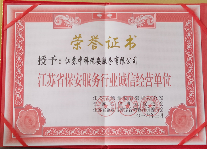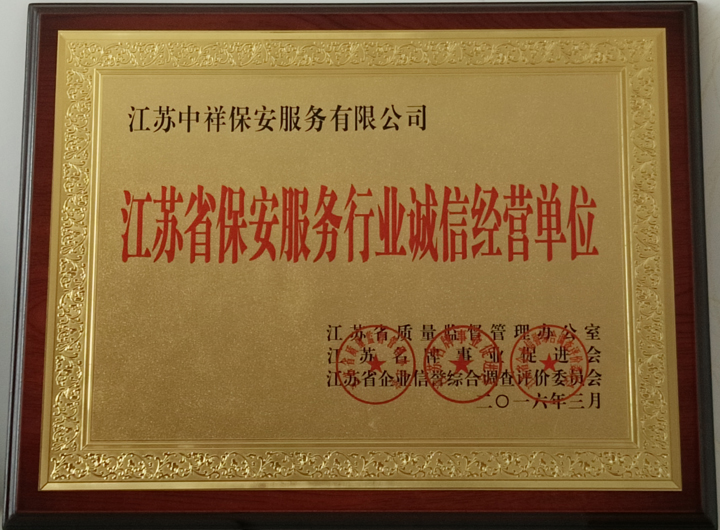 江蘇中祥保安公司榮獲江蘇省保安服務(wù)行業(yè)誠信經(jīng)營單位